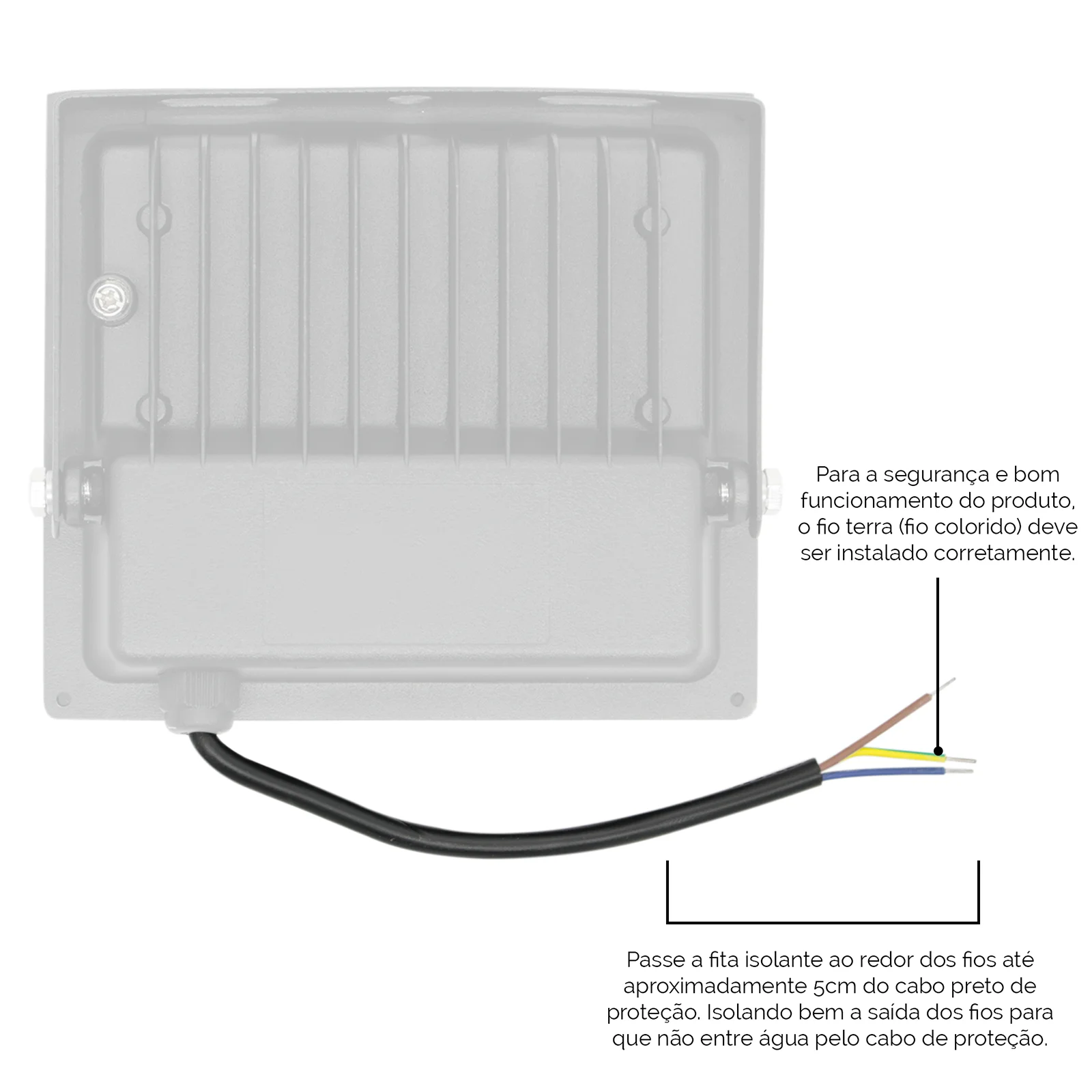 O fio terra (bicolor) deve ser devidamente utilizado na instalação, sob a possibilidade de futuros danos ao refletor, causados pela instabilidade elétrica.Uma não instalação ou instalação incorreta do fio terra acarreta na perda da garantia, pois trata de mau uso do material e não defeito de fabricação.